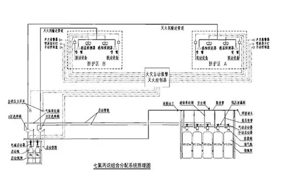 同一防護區,當設計兩套或三套管網時,集流管可分別設置,系統啟動裝置必須共用。各管網上噴頭流量均應按同一滅火設計濃度、同一噴放時間進行設計